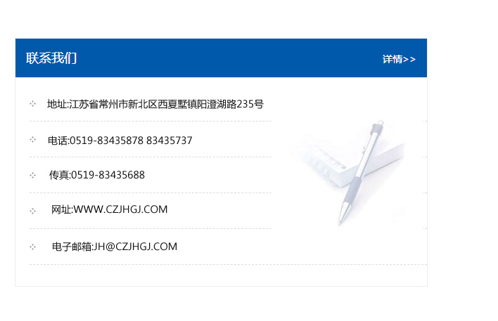 地址:常州市新北區友邦商務大廈1幢16、17層  電話:0519-85101652  傳真:0519-85112595  郵編:213022  網址:www.cz-jiayue_cn.daawan.com  郵箱:xiajifengaa@163.com